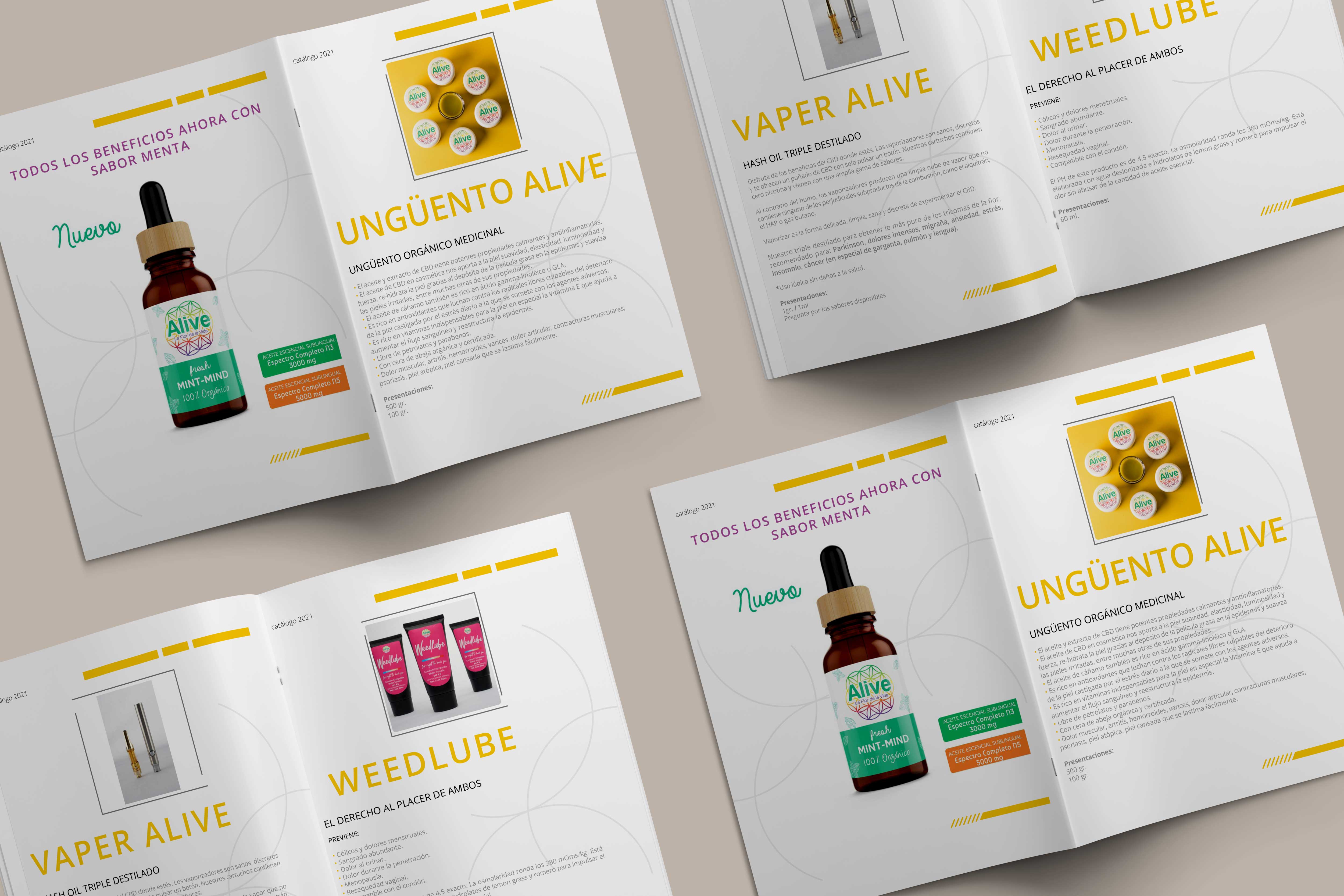 Diseño de catálogo de productos para Alive, empresa dedicada a la venta de CBD en diferentes presentaciones.