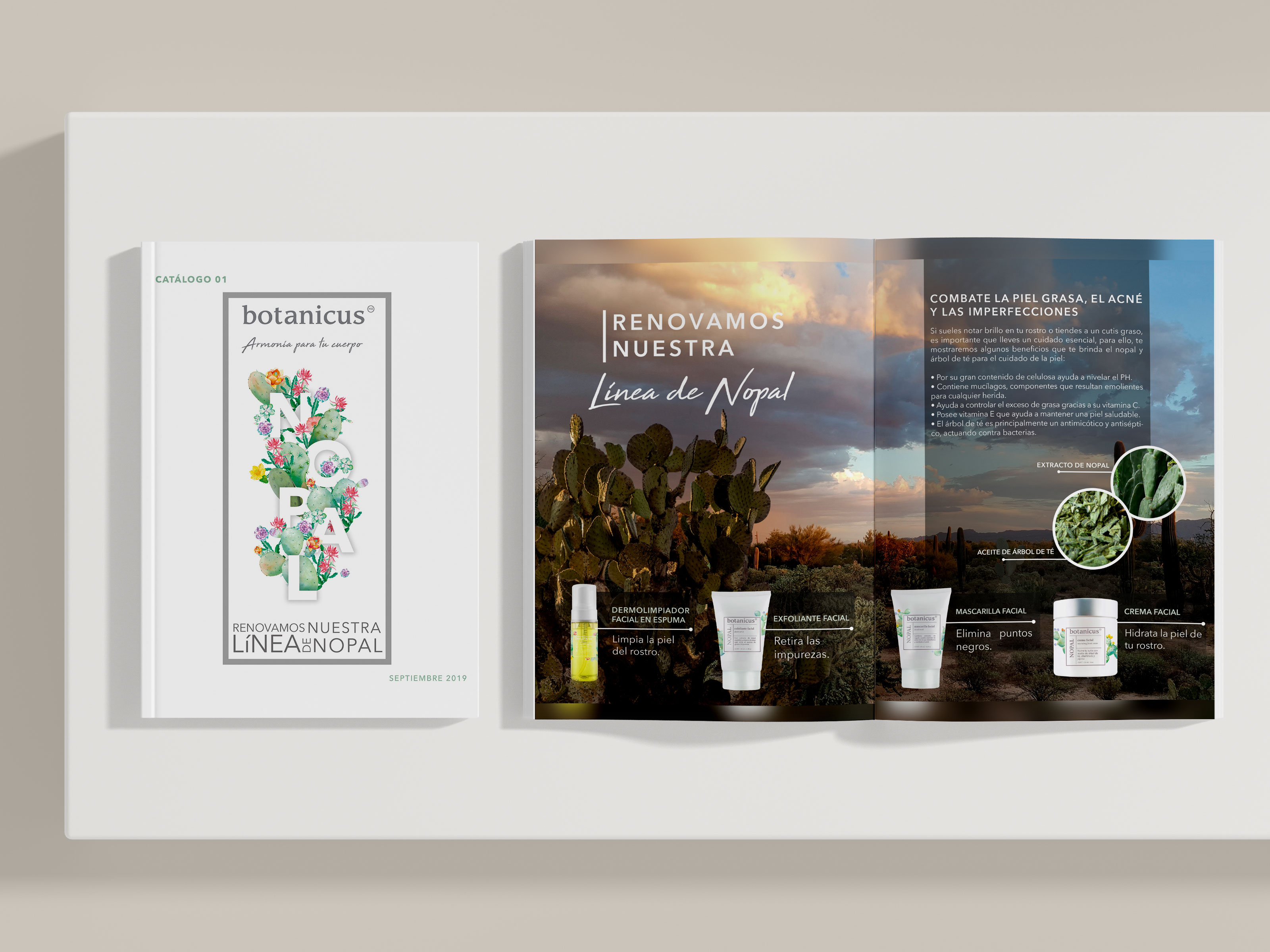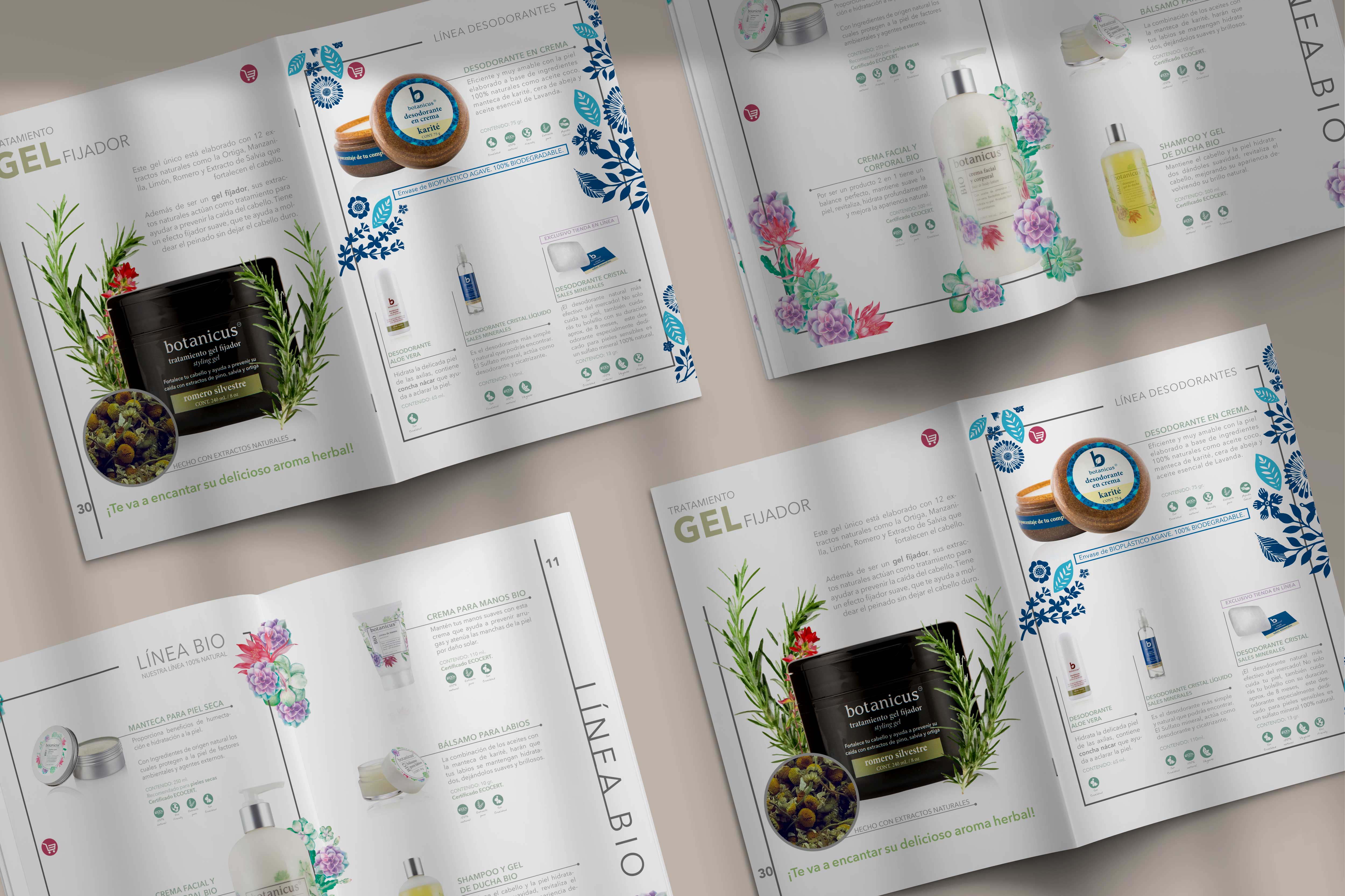 Diseño de cátalogo de productos para Botanicus, empresa morelense dedicada a la venta de productos para el cuidado de la piel; se desarrolló la idea gráfica respetando lineamientos del logotipo, paleta de color y línea gráfica existente de los productos.